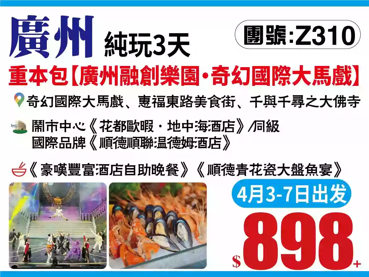 風光攝影會員尊享廣州融創樂園·奇幻國際大馬戲順德順聯溫德姆酒店豪歎酒店豐富海鮮自助晚餐順德青花瓷大盤魚宴