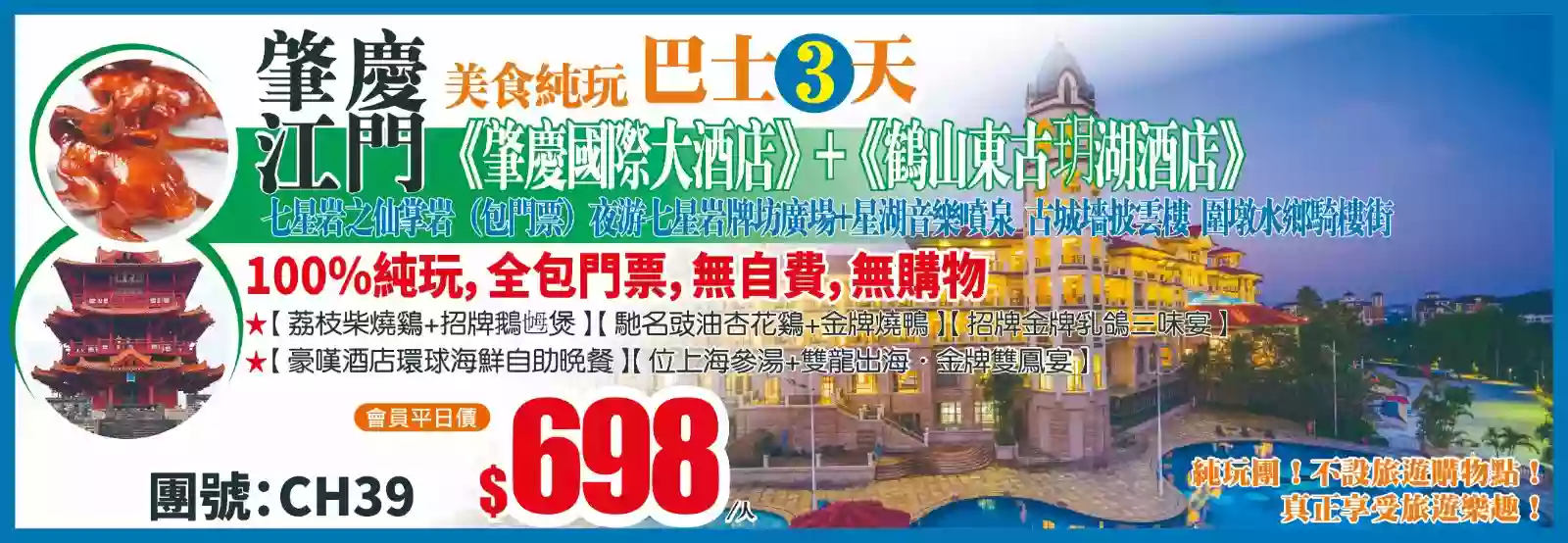 豪華酒店廚神推介《肇慶國際大酒店》《鶴山東古玥湖酒店》【豪歎酒店環球海鮮自助晚餐】、七星岩步行街