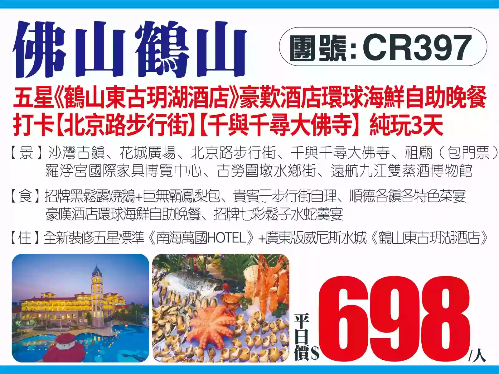 豪華酒店廚神推介《肇慶國際大酒店》《鶴山東古玥湖酒店》【豪歎酒店環球海鮮自助晚餐】、七星岩步行街