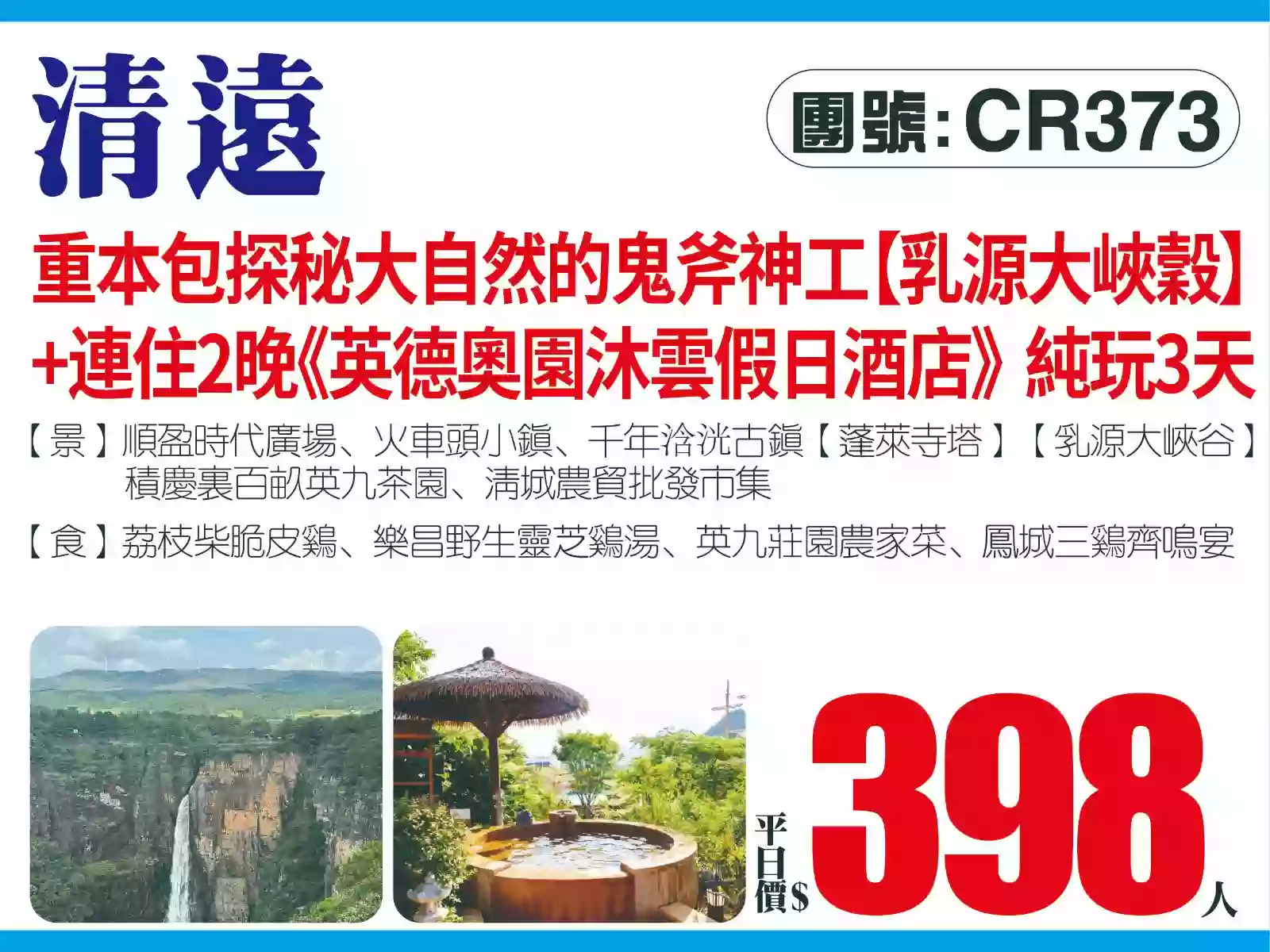 温泉度假風光攝影重本包探秘大自然的鬼斧神工【乳源大峽穀】連住2晚《英德奧園沐雲假日酒店》(無限次浸泡喀斯特茶語湯泉及水世界樂園)
