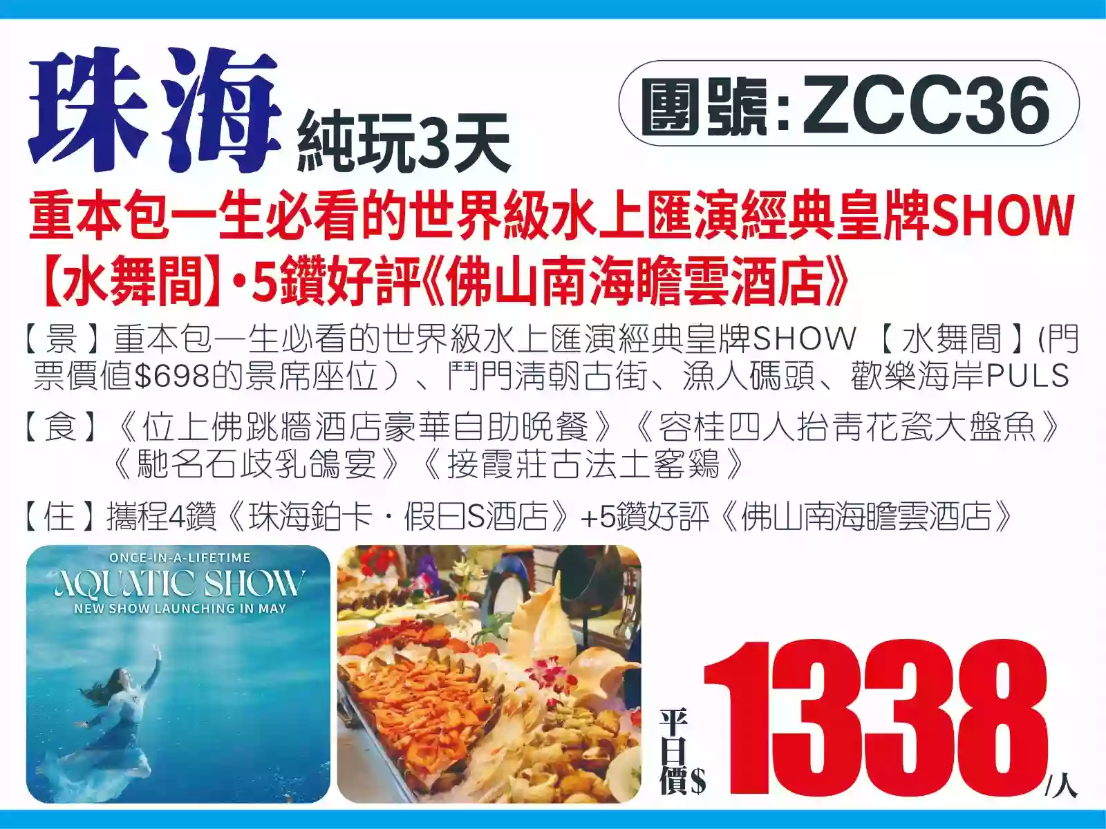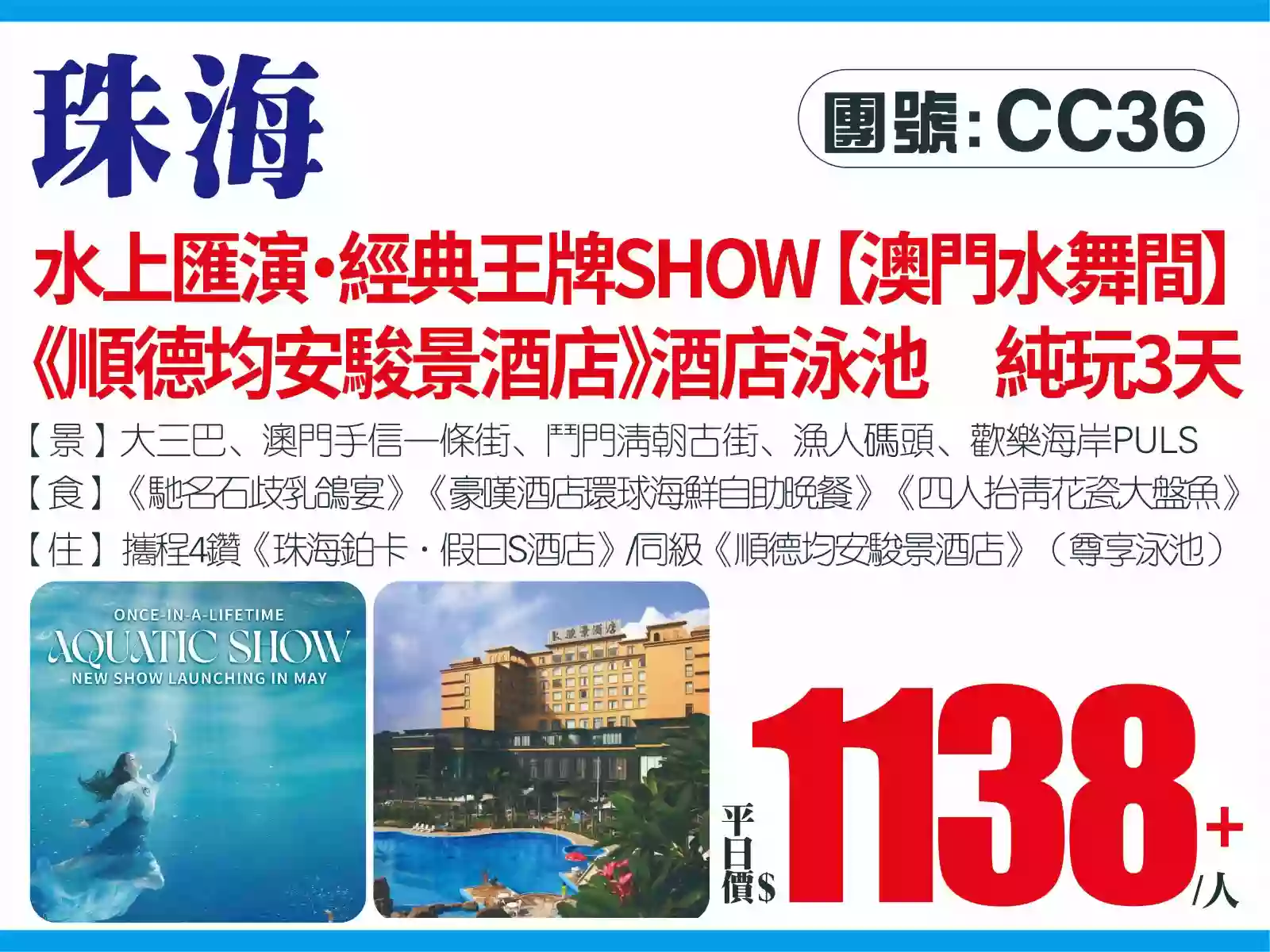 主題樂園重本包一生必看的世界级水上匯演經典皇牌SHOW【水舞間】《順德均安駿景酒店》尊享酒店泳池《豪歎酒店環球海鮮自助晚餐