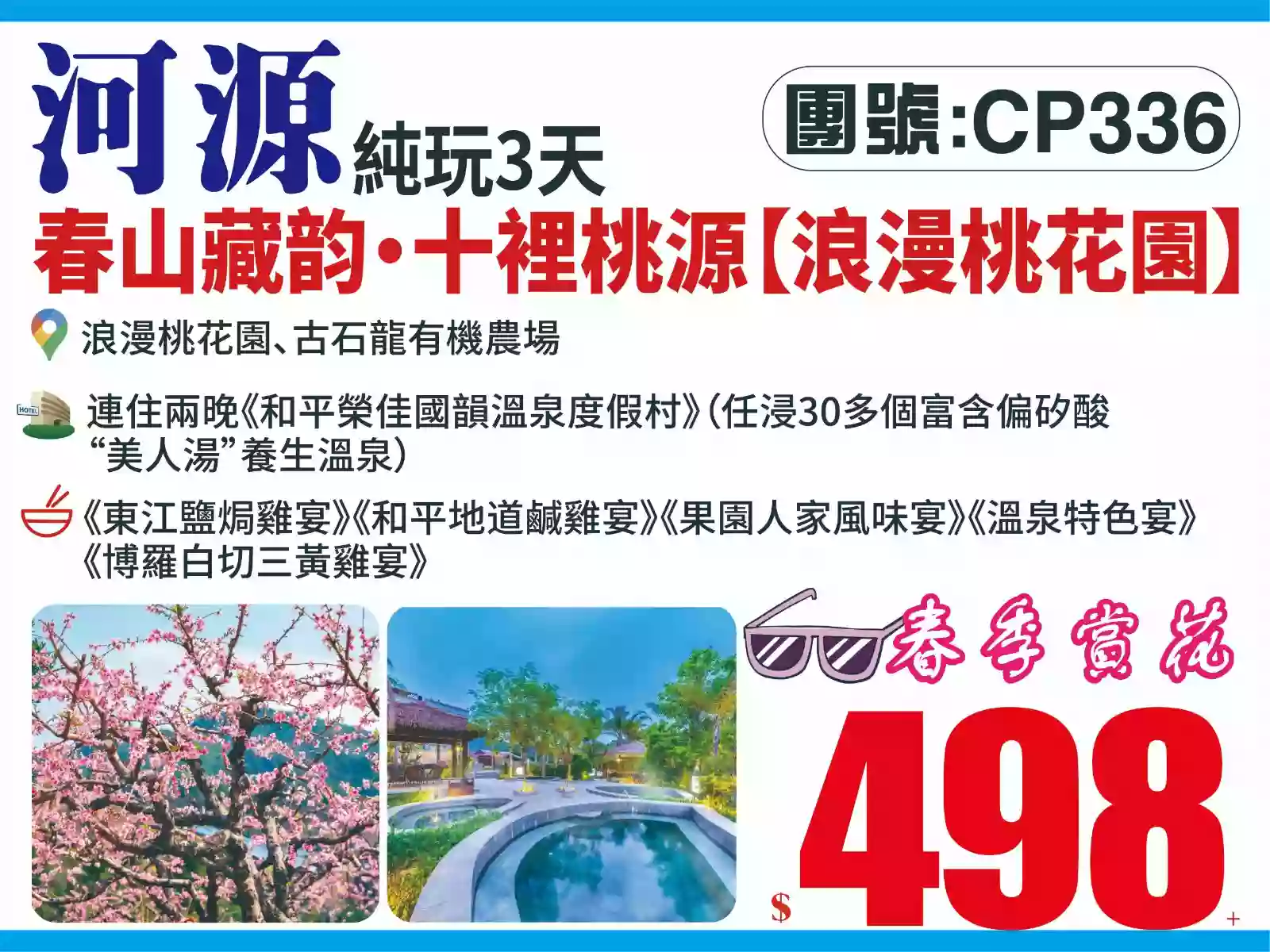 温泉度假充足時間浸溫泉2晚連住《和平九連山溫泉度假山莊南湖東岸》枇杷花豬骨湯·豉油雞宴